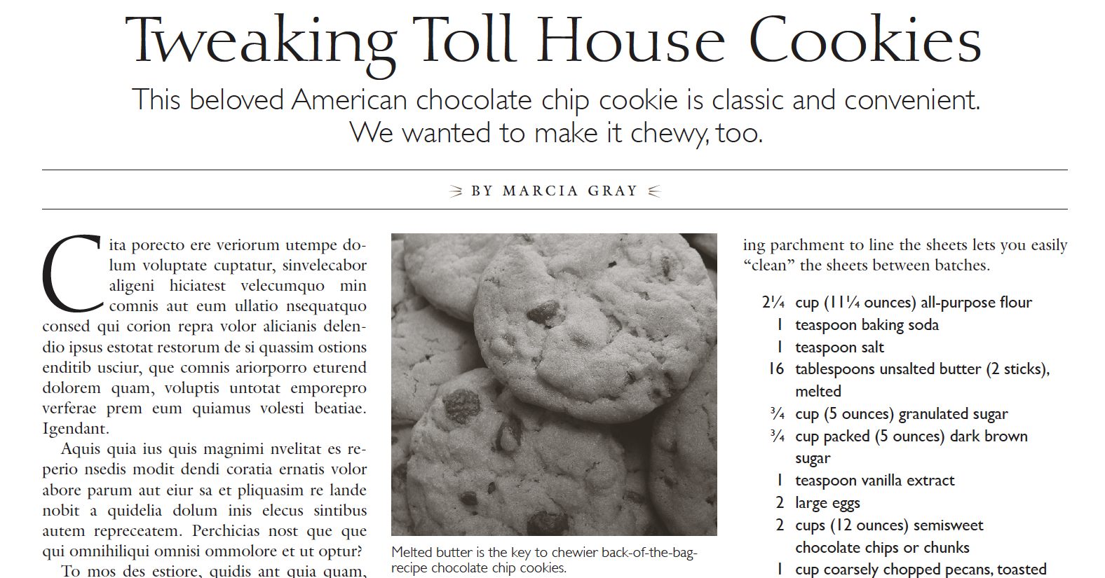 Assignment: Take the “back-of-the-bag” Toll House cookie recipe and write it in two different ways modeled after cookbooks, food magazines, food writers, or food blogs. I took the assignment a step further and also formatted the recipes to capture the look and feel of the respective publications. The PDF contains a fictional Cooks Illustrated version of the … Read more