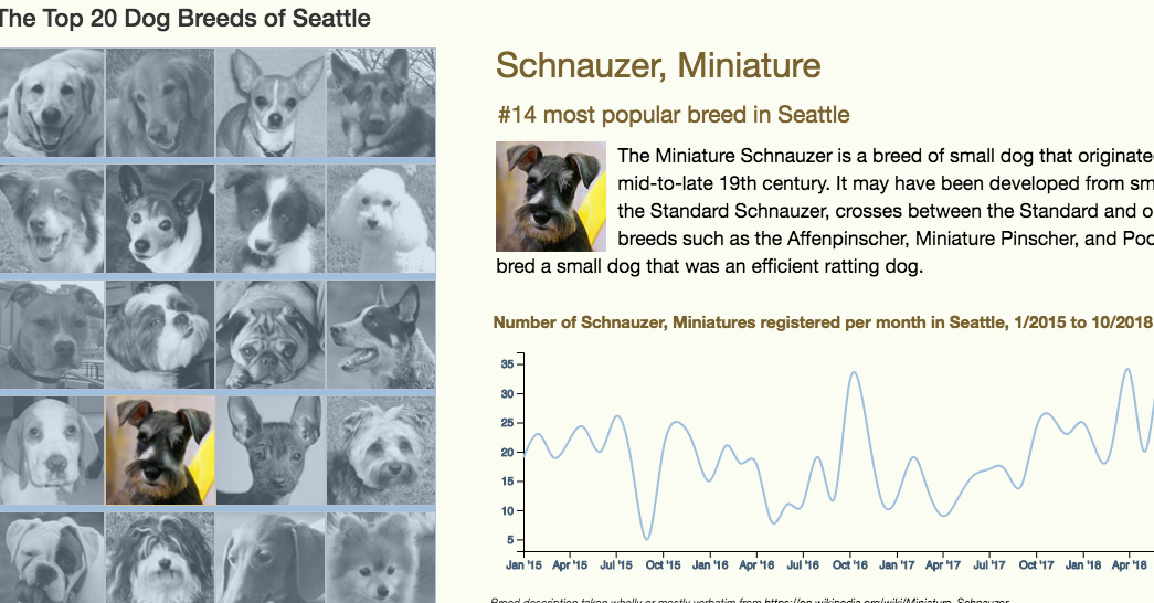 This interactive graph was created as part of a final group project for a class on data visualization.The photo grid and individual graphs are generated on the fly via code I wrote in JavaScript and d3.js and a pet-registration data file of over 85,000 records. I also provided a color palette for the site.